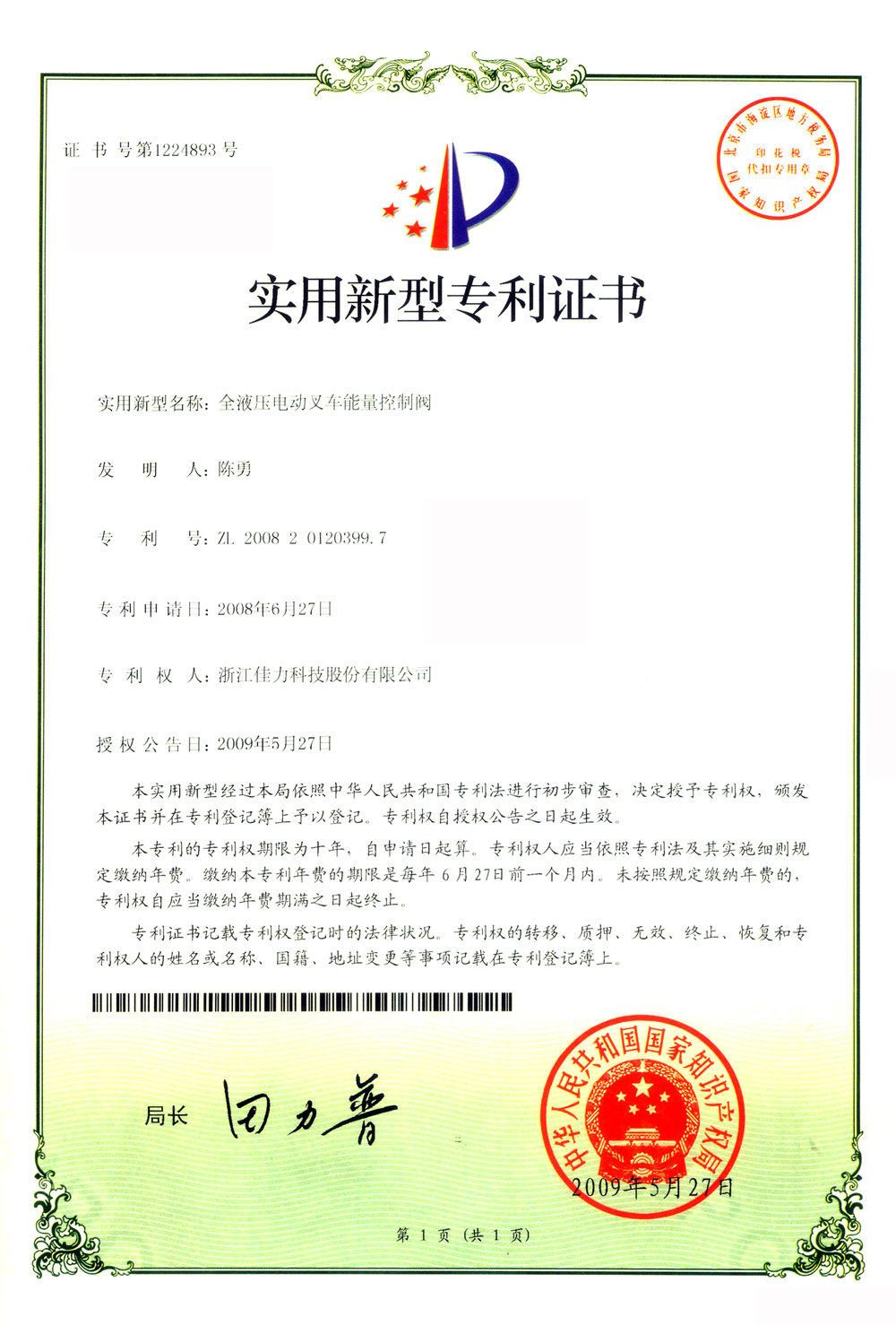 實(shí)用新型專(zhuān)利證書(shū)