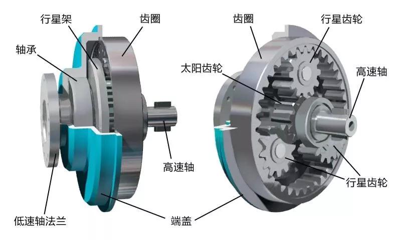 行星輪由一個太陽輪加上三個行星輪套在行星架上,外面再套一個大齒圈組合而成。