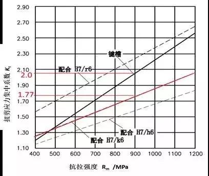 軸受純扭轉時,鍵槽和配合邊緣處的有效應力集中系數Kτ見圖7[1]所示。當軸的抗拉強度Rm=900MPa時,鍵槽的有效應力集中系數Kτ=2。因此鍵槽對軸的削弱是很大的。