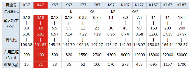 K系列減速機,結合國際技術要求制造,具有很高的科技含量,節省空間,可靠耐用, 承受過載能力高,功率可達200Kw,能耗低,性能優越,減速機效率高達95%以上,振動小,噪音低,節能高,選用優質鍛鋼材料,鋼性躊鐵箱體,齒輪表面 經過滲碳淬火,經過精密加工,構成了斜齒輪、傘齒輪,錐齒輪傳動總成的減速機。