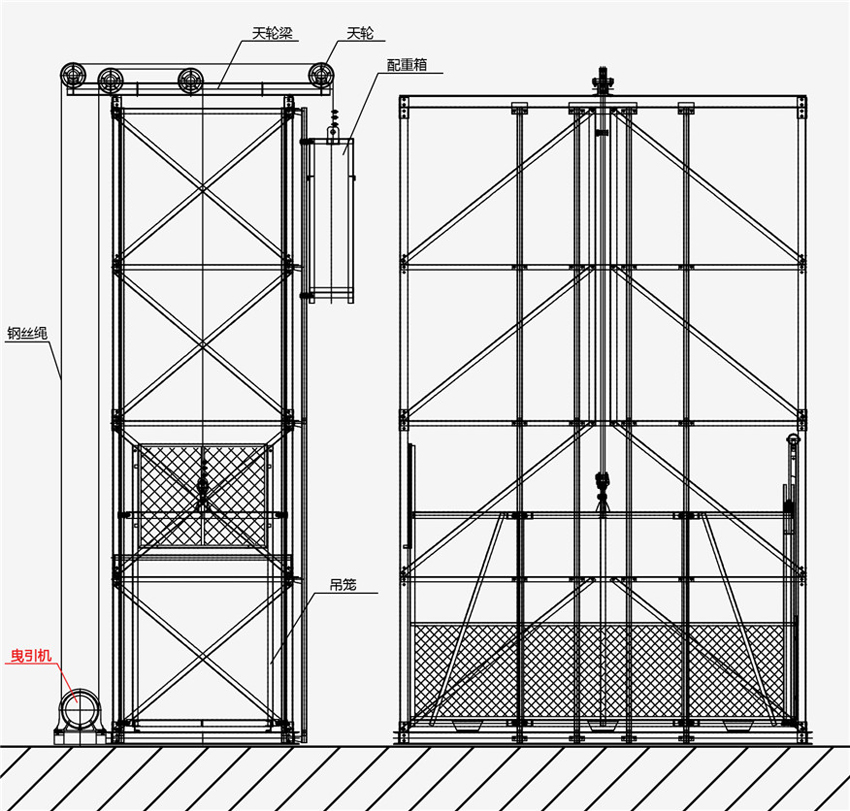 提高載重量。利用曳引機實現吊籠升降的升降設備工作原理與客梯類似,在井架一側裝有配重與吊籠自重相互抵消。進而提高了載重量。